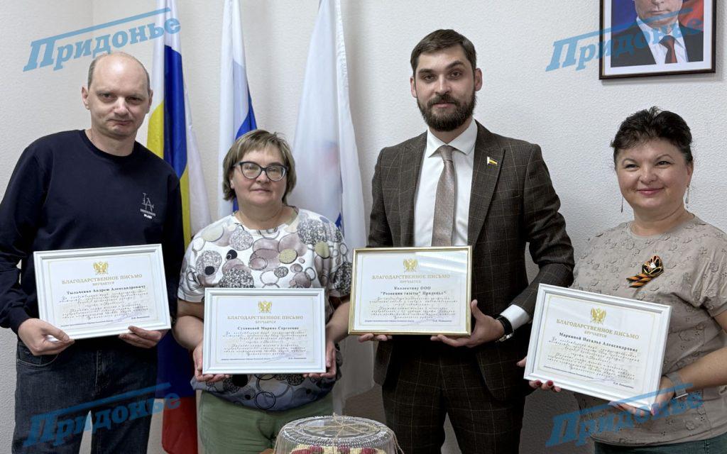 Николай Владимирович выразил благодарность за верность профессии, ответственное отношение к каждому выпуску газеты, мастерство и вручил Благодарственные письма коллективу редакции «Придонья», директору-главному редактору М.С.Сухановой, её заместителю А.А.Тыльченко и журналисту Н.А.Маркиной, пожелав дальнейших успехов в работе.