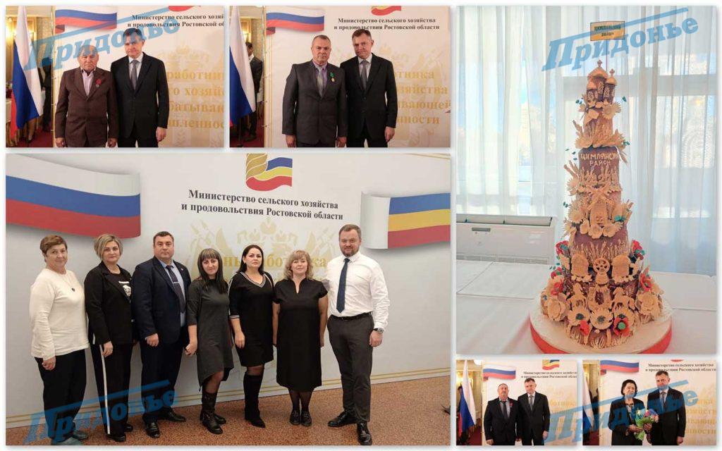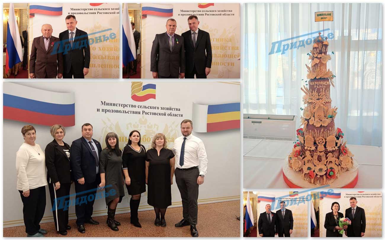 Высоких наград удостоены и труженики Цимлянского района. Медали «За труды по сельскому хозяйству» получили С.И.Гнездилов и Т.Ю.Семенко; медали ордена «За заслуги перед Отечеством II степени» А.И.Максимов, А.А.Мусенко, А.С.Ремизов; Кубки и Дипломы победителей – И.В.Гуляев, А.А.Сидорова, Л.А.Корнилова; Благодарственное письмо – М.С.Геворкян. В номинации «Лучший сельскохозяйственный товаропроизводитель природно-климатической зоны площадью до 1000 га» победил глава КФХ В.И.Гуляев, а в климатической зоне площадью более 5000 га – лучшим стало АО им.Ленина.