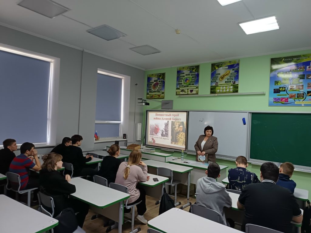 В сош №2, 8 Б классе прошёл патриотический час «Неизвестный Герой войны Алексей Берест». Мероприятие провела сотрудник Цимлянской межпоселенческой библиотеки Н.К.Кучкина, .