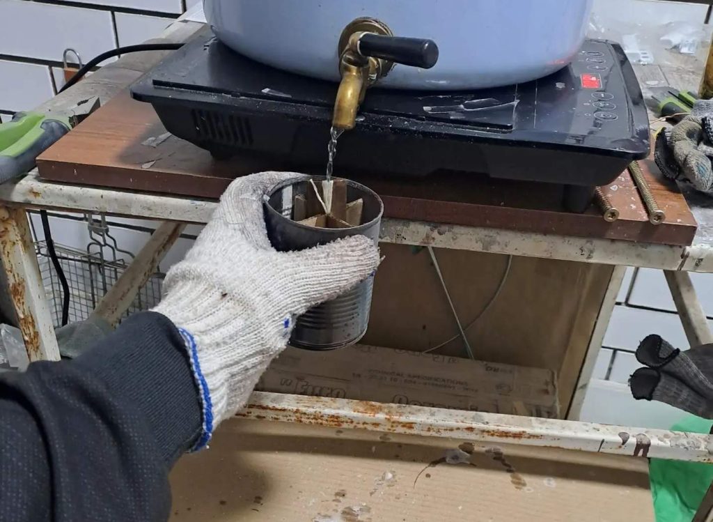 — Чаще, конечно, парафин я покупаю сам. Иногда – привозят товарищи из группы. Михаил Приходько закрепил к эмалированной кастрюле латунный кран, как у самовара. В ней я нагреваю парафин, который струйкой сливается в подготовленные банки. В среднем за четыре вечера непрерывной работы выходит 70 окопных свечей, — рассказывает электромонтёр по обслуживанию электроподстанций ВЭС Олег Викторович Юрин.