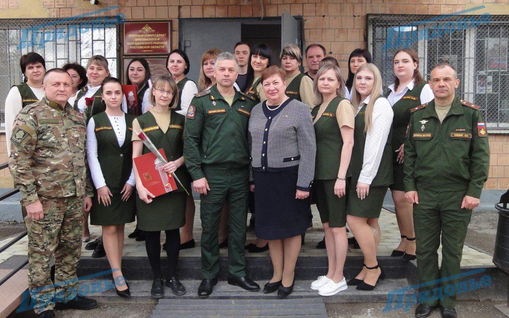 Заслуженную награду в присутствии всего коллектива Ольге Петровне вручил военный комиссар В.А.Польшков. Торжественное награждение прошло сразу после профессионального праздника – Дня сотрудников военных комиссариатов, когда в гости к коллективу с поздравлениями пришла глава Администрации Цимлянского района Е.Н.Ночевкина.