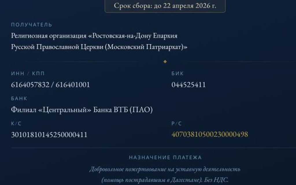 Ростовская-на-Дону епархия объявила кружечный сбор во всех храмах и монастырях епархии для помощи народу Дагестана. Сбор средств будет проходить до 22 апреля 2026 года.